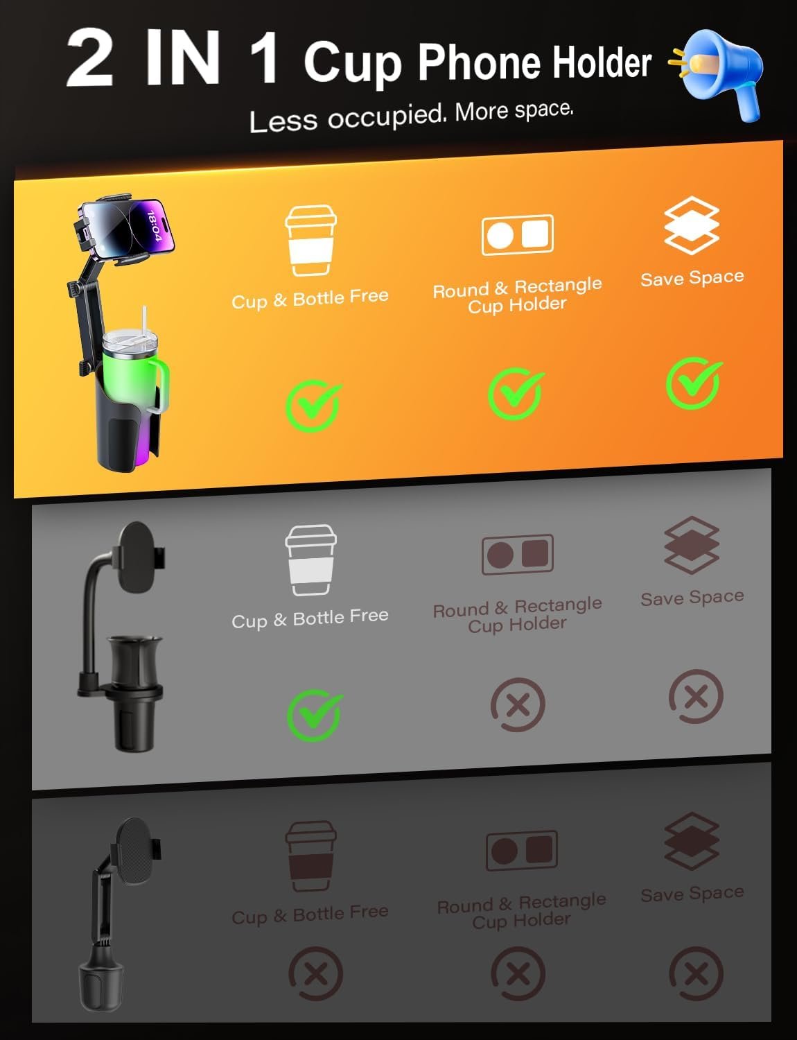 • Neat, Elegant, Efficient: Unlike other cup holder cell phone mount, it uses a C-shaped hollow base design. This allows the cup holder cell phone mount to be firmly mounted in the cup holder without taking up space in the cup holder like others do. So you can still put your phone, keys, wallet, etc. inside the cup holder, which makes your car interior space more neat and elegant. It fits all 2.5-4.0 inches round and rectangular cup holders. Fits trucks, SUVs, boats, massage chairs etc.