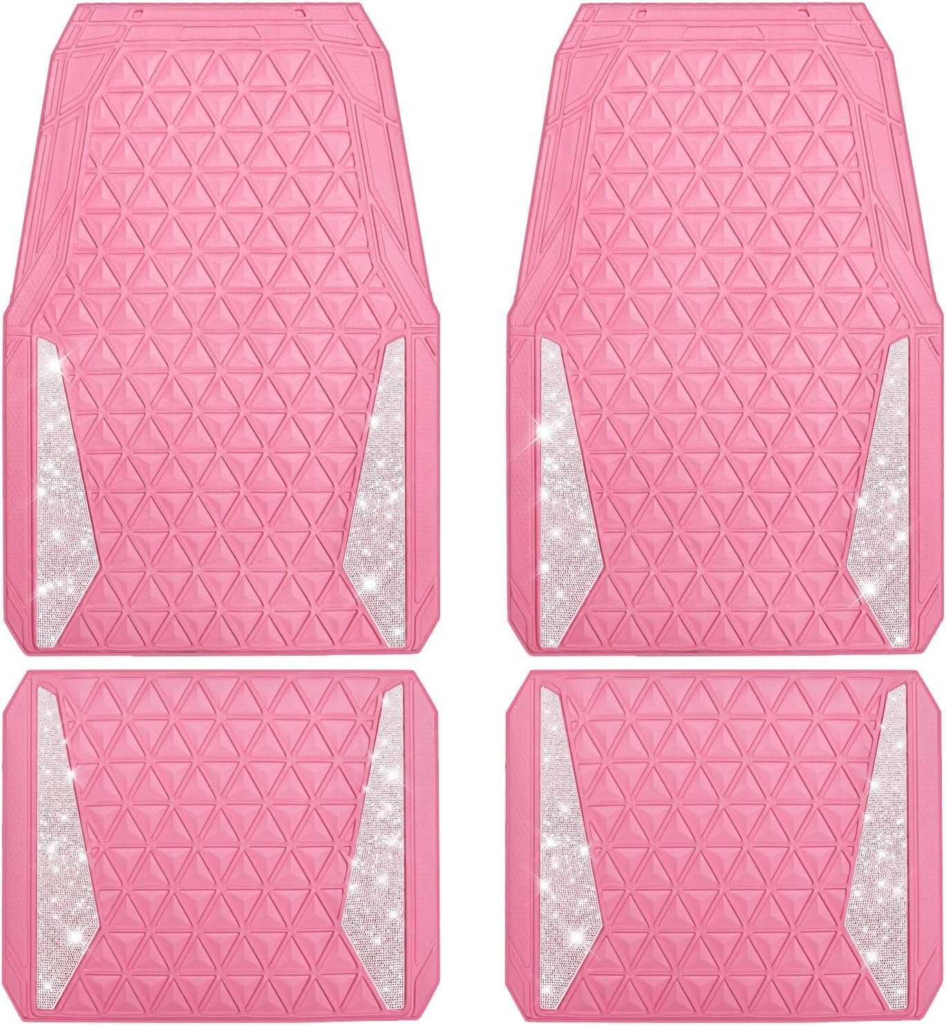 - DIAMOND RUBBER: Made of high quality rubber, side on the rubber car mats has shining rhinestone, 4 pcs full set. The diamond rubber car floor mats use for all season. Protect your truck’s floors from dirt and debris. Easy to clean. Made of high quality sparkly diamond. Shininig diamonds don’t fall out. Glitter in the sun and bring a nice vibe to the interior of your car.